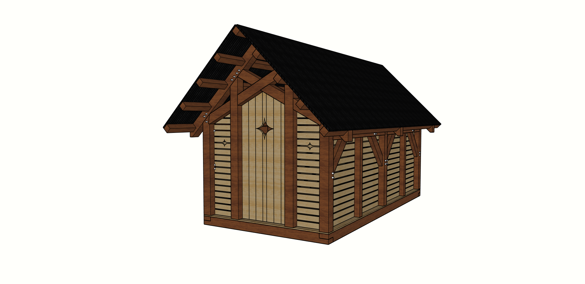 The Pine Marten was conceived as a dual-purpose structure that bridges the gap between functional utility and handcrafted beauty, giving property owners a building that works as hard as it looks good. The scissor truss roof form was chosen deliberately — its elevated interior pitch creates a sense of spaciousness well beyond what the footprint suggests, while also providing the structural performance needed to handle demanding snow and wind loads. In the greenhouse configuration, the design prioritizes light and airflow, ensuring that the interior environment supports healthy plant growth throughout all four seasons without the need for excessive supplemental heating. In the woodshed configuration, the open bays and elevated framing promote natural air circulation around stored wood, accelerating the seasoning process and protecting the investment of a well-stocked fuel supply. Above all, the Pine Marten is designed to age gracefully — the hand-cut joinery, custom stain finish, and honest timber construction are intended to deepen in character over time, making the structure a lasting and valued feature of any property.